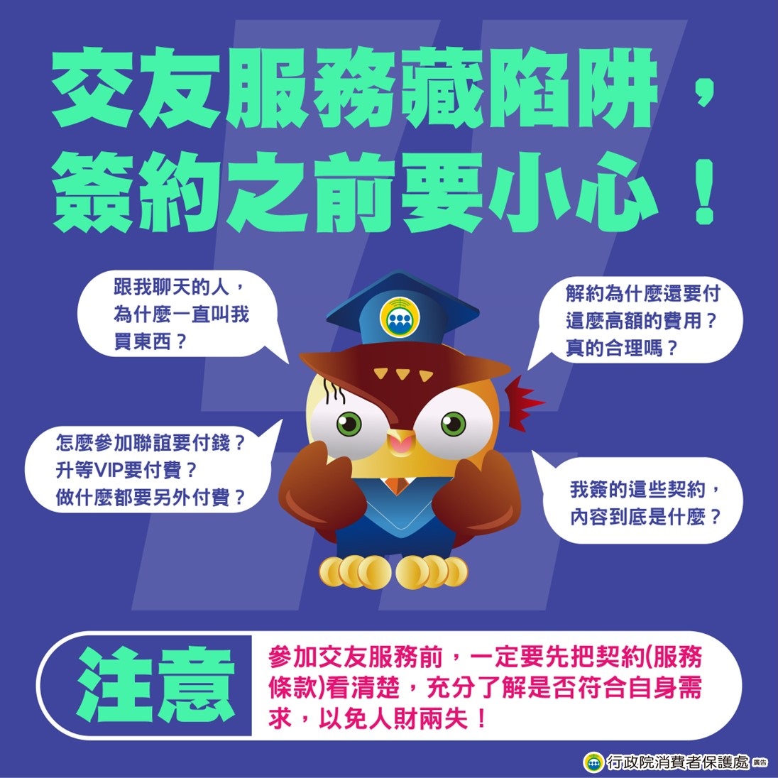 參加交友服務前,一定要先把契約條款看清楚,充分了解是否符合自己需求,並確認業者有無遵守個人資料保護法等相關法令;與網友聊天時,有關金錢方面的請求應再三評估確認,避免上當。