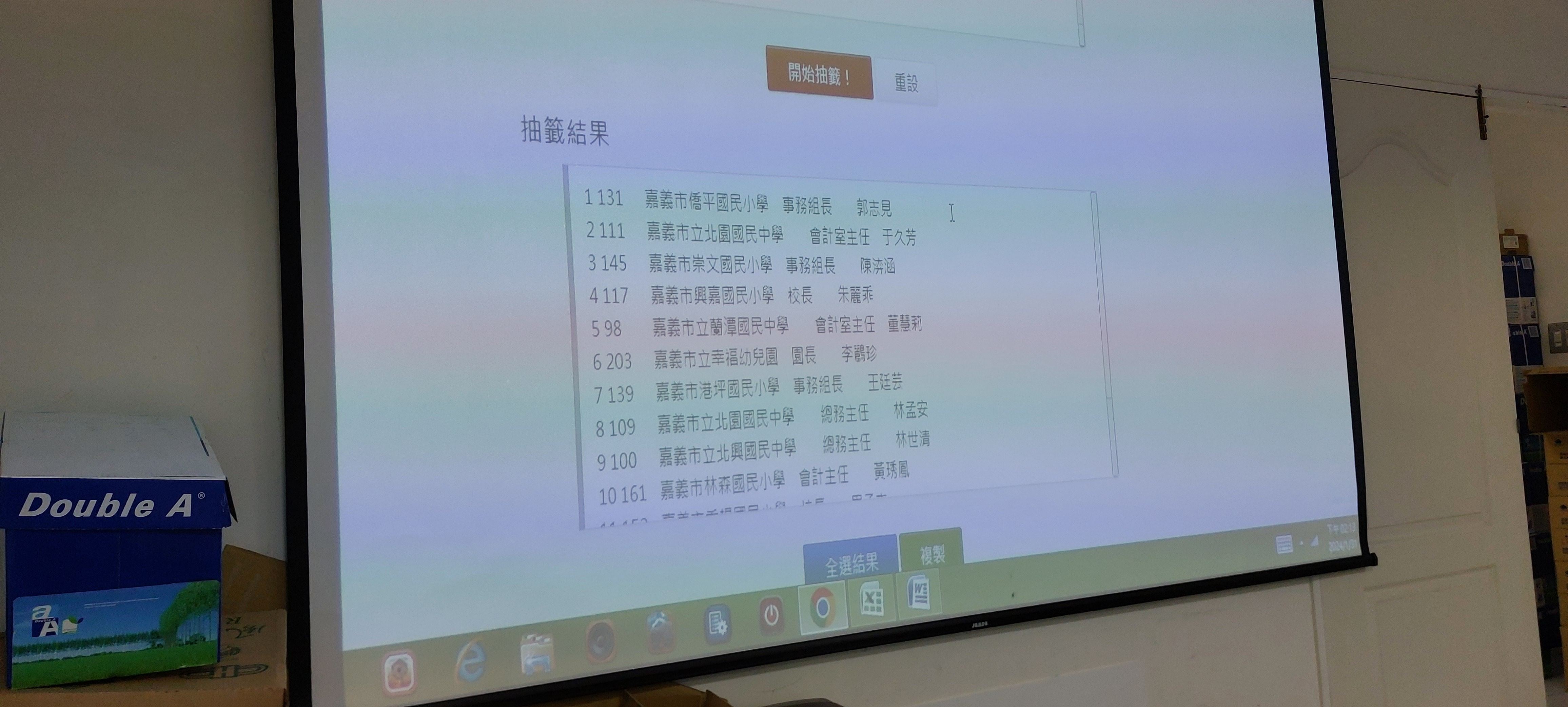 嘉義市政府113年1月31日在秘書長陳永豐主持及主計處阮鼎元處長、人事處楊景丞處長、教育處林喜信副處長公證下,用電腦隨機亂數抽選方式,隨機抽出辦理實質審查申報人員,全程錄影以昭公信。