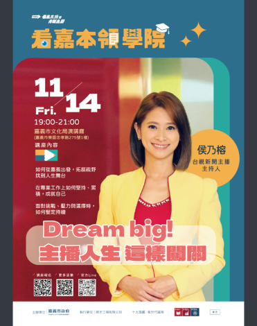 主題:Dream big!主播人生這樣闖關。 講者:侯乃榕 台視新聞台主播主持人。 日期:114年11月14日(星期五)19:00-21:00。 地點:嘉義市文化局演講廳(嘉義市東區忠孝路275號1 樓)。